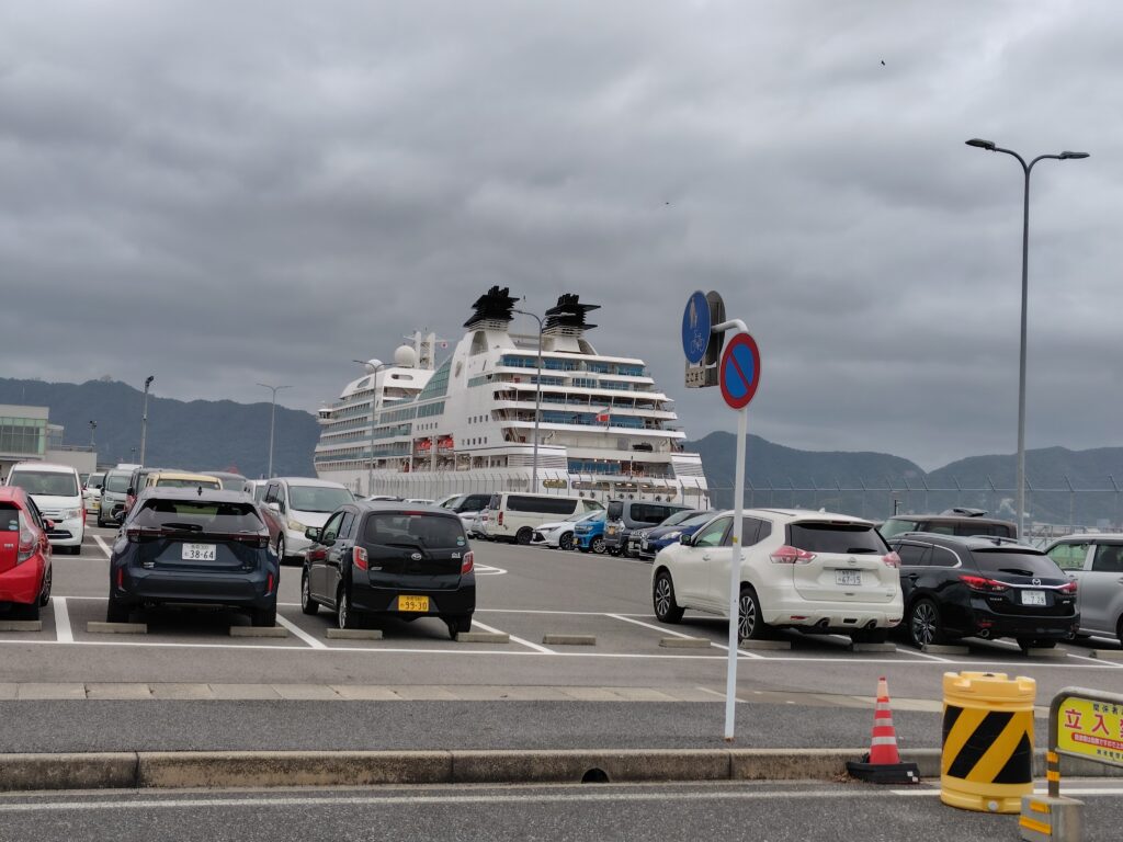 また、北側には大型のクルーズ船が着岸可能な境夢みなとターミナルもあります。ここは CIQ (税関/入出国管理/検疫)の機能施設を備えた西日本有数の国際旅客船ターミナルで、数多くの大型国際クルーズ船が寄港します。米子にある王子製紙米子工場に原料である木質チップを供給するために境港には元々大型貨物船が着岸可能な港湾施設があり、そこを拡張して大型の観光クルーズ船のためのターミナルを整備したのです。大型観光バスが利用可能なバスターミナルや、広い駐車場なども併設されています。わたしが訪れた日も、岸壁にはクソバカでかいクルーズ船が停泊していました。
