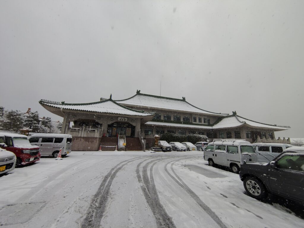 建物のデザインはもちろん中華風。わたしが訪れた時はちょうど雪が降っていました。