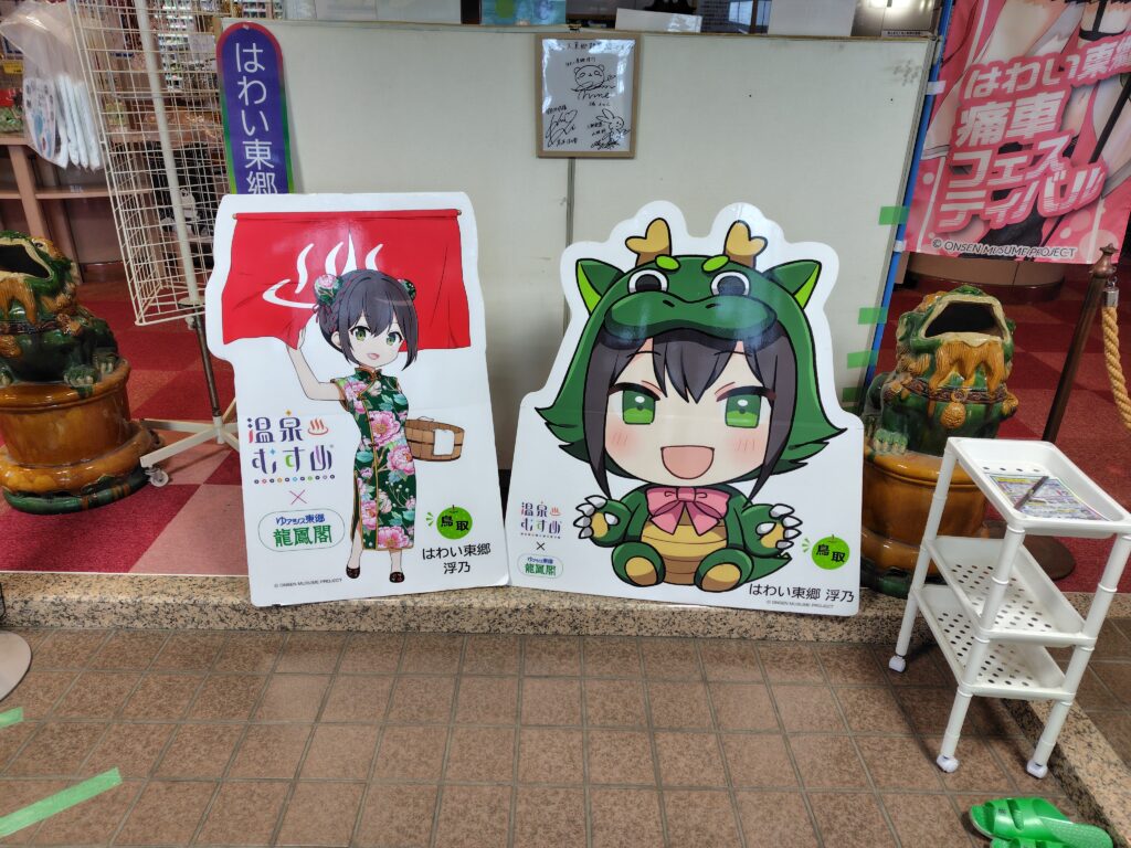 温泉むすめの当地担当、はわい東郷浮乃のスタンド POP 二連発! しかも、このチャイナドレス姿とドラゴン着ぐるみ姿は龍鳳閣のためだけに描かれた描きおろしと判断せざるを得ません。もちろん、館内のお土産品コーナーではこのグラフィックを使用した缶バッチとか買えちゃいますぞ、フヒヒ(気持ちの悪いオタクムーブ)